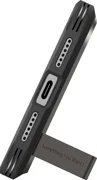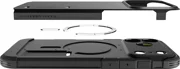 Vgrajen magnetni obroč MagSafe zagotavlja stabilno in varno pritrditev na dodatke Apple, kot so brezžični polnilniki, avtomobilski nosilci ali magnetne denarnice. S to rešitvijo lahko uživate v polni funkcionalnosti sistema MagSafe, ne da bi pri tem ogrozili zaščito naprave. Ohišje Tough Armor "T" odlikuje masivnejša, a še vedno ergonomska konstrukcija. Opremljeno je z značilnim zložljivim stojalom, ki omogoča, da telefon priročno nastavite v ležeči način - kot nalašč za gledanje filmov ali video klice. Dvignjeni robovi okoli zaslona in kamere ščitijo najbolj ranljive elemente, natančni izrezi in odzivni gumbi pa zagotavljajo popolno udobje pri uporabi.